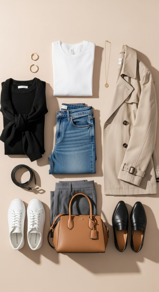 After that, create simple outfit formulas. For example: blazer, T shirt, straight jeans and loafers. Or knit sweater, tailored trousers and ankle boots. Or trench coat, white tee, dark denim and sneakers. These formulas become your go to combinations for busy days.
